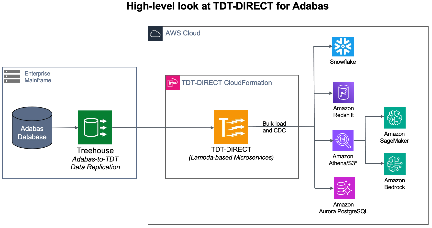 Treehouse Dataflow Toolkit (TDT-DIRECT) for Adabas enables rapid bulk load and CDC data transfer from mainframe z/OS and VSE Adabas to Snowflake, as well as to Amazon Redshift, Amazon Athena/S3, and Amazon S3 Express One Zone.