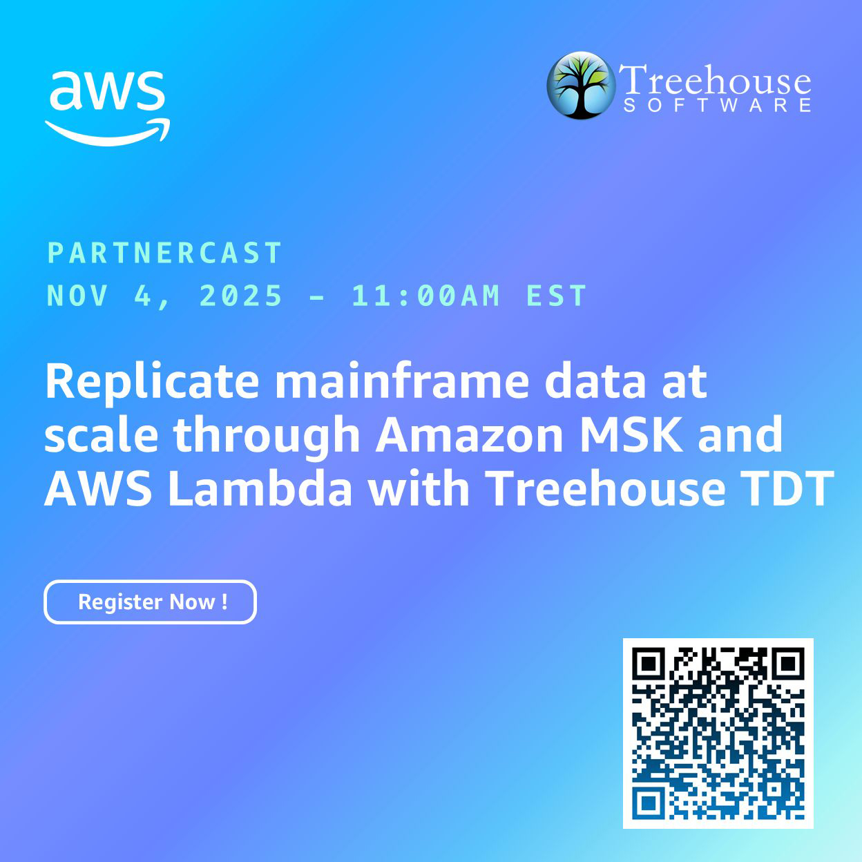 You are invited to attend the Treehouse Software and AWS Partner Cast on November 4th . During a customer case study, we will demonstrate how Treehouse Dataflow Toolkit (TDT) revolutionizes mainframe data replication in AWS environments without disrupting the existing critical work on the legacy system. |