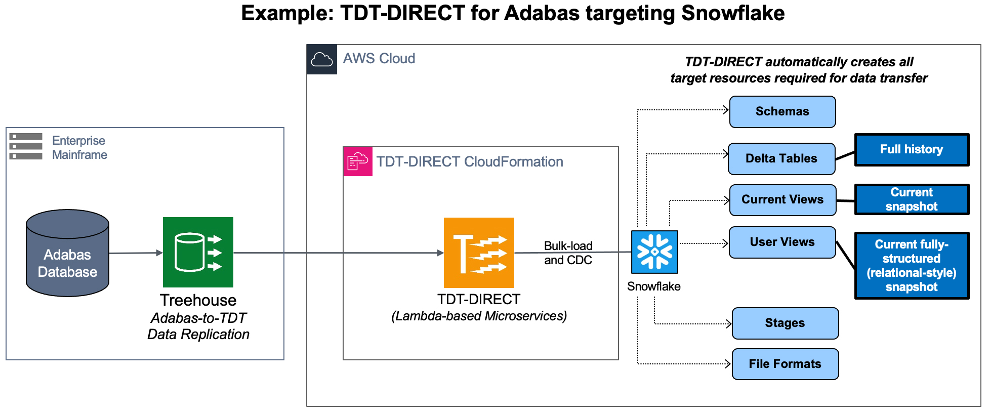 Treehouse Dataflow Toolkit (TDT-DIRECT) for Adabas enables rapid bulk load and CDC data transfer from mainframe z/OS and VSE Adabas to Snowflake, as well as to Amazon Redshift, Amazon Athena/S3, and Amazon S3 Express One Zone.